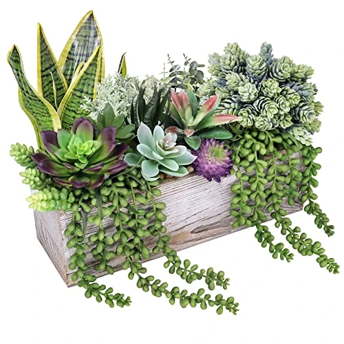 - Color: This artificial succulent plant arrangement is overflowing with a wide variety of faux succulents in various shades of green and purple with lots of texture. The succulents come artfully potted in a distressed wooden planter box given a rustic look to blend in any farmhouse decor style. Natural pebbles are added for realism.