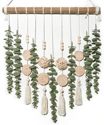 - 【Purely Handmade, Value for the money】 This eucalyptus wall hanging is pure handmade. It may vary slightly in shape and size due to each detail being hand crafted. Eucalyptus vines, wood slices, beads, tassels are purely hand tied to the branches.