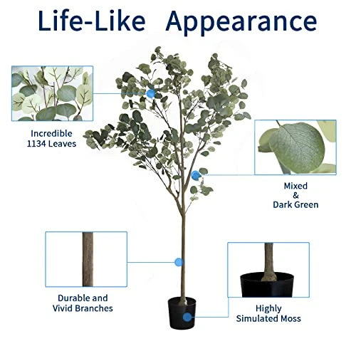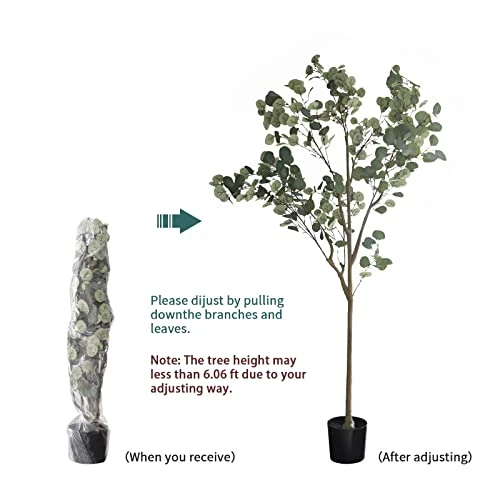 - 3. Material: The nearly natural artificial eucalyptus trees, leaf is made of silk, They are processed with dying, odorless, won’t fade and they are also waterproof, The eucalyptus tree branches is thick and sturdy, will not deform or break, The planter of tree can be used for a long time and will not become fragile over time.