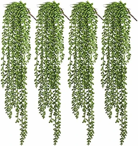 - Package: 4 artificial hanging string of pearls plant, Basket is not included. ( Each string has 5 branches)