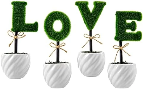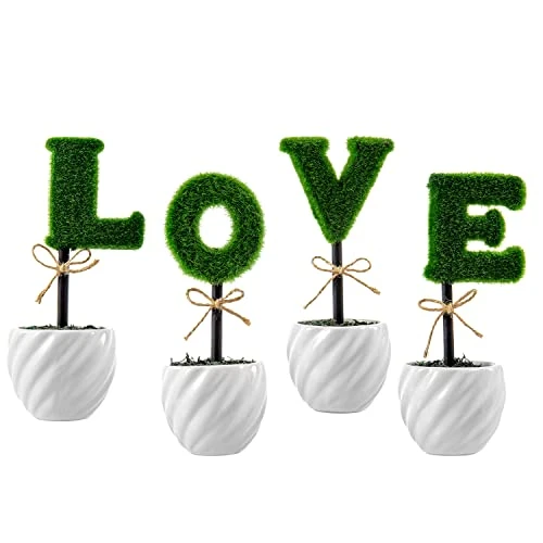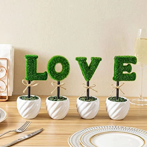- Boasts 4 individual pots, each with a smooth curving ceramic base with an artificial hedge plant perched at the top of a stick bearing one of the 4 letters in L-O-V-E